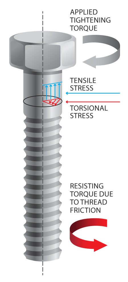 When tightening a bolt or nut, the applied torque must overcome the thread friction, the friction under the bolt head or nut and the inclined plane of the thread, to obtain a bolt preload (see Fig. 1A).