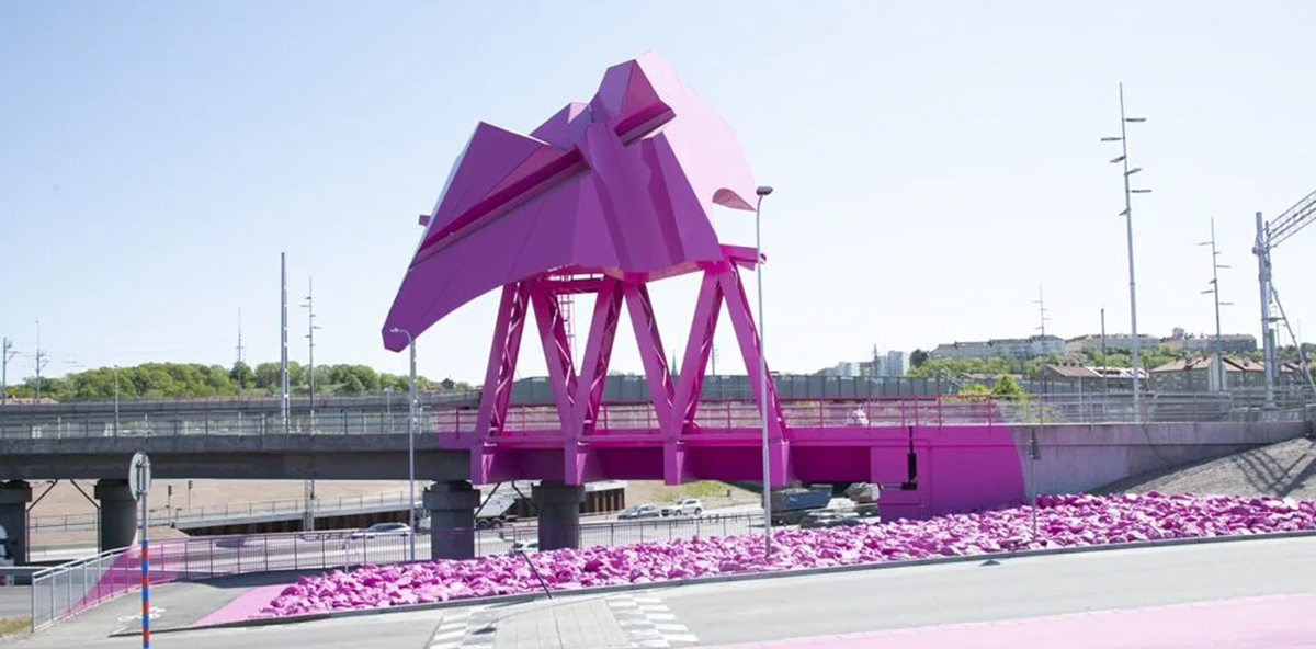 In Gothenburg, Sweden, more precisely the traffic junction Olskroken, there’s one example of such a recent public infrastructure project, designed and built with the explicit purpose of enriching our lives with its contemplative expression. Set on a railway bridge that spans over the heavily trafficked E6 highway beneath, the artwork bLINK, created by the Swedish artist Katharina Grosse, instills a splash of pink and intricate pattern of steel in the middle of the otherwise grey traffic junction.
