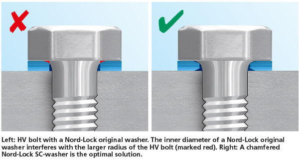 The Nord-Lock Group has developed a locking washer specially designed to fit the HV/HR sets. Each Steel Construction (SC) washer pair has chamfers on the inner diameter to ensure an optimal contact surface between the bolt and the washer. Nord-Lock wedge-locking technology secures the bolt with tension instead of friction preventing the bolt from rotating loose. The washer is CE approved to be used together with HV bolt sets.